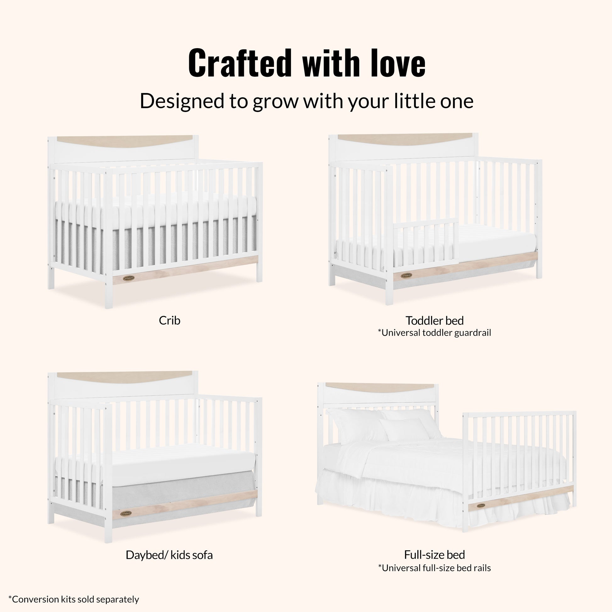 The Dream On Me Emerson 5-in-1 Convertible Crib offers timeless design and versatility, transitioning from a crib to a toddler bed, daybed, and full-size bed. Made with non-toxic, water-based paint, it ensures safety and durability for every stage of your child's growth.