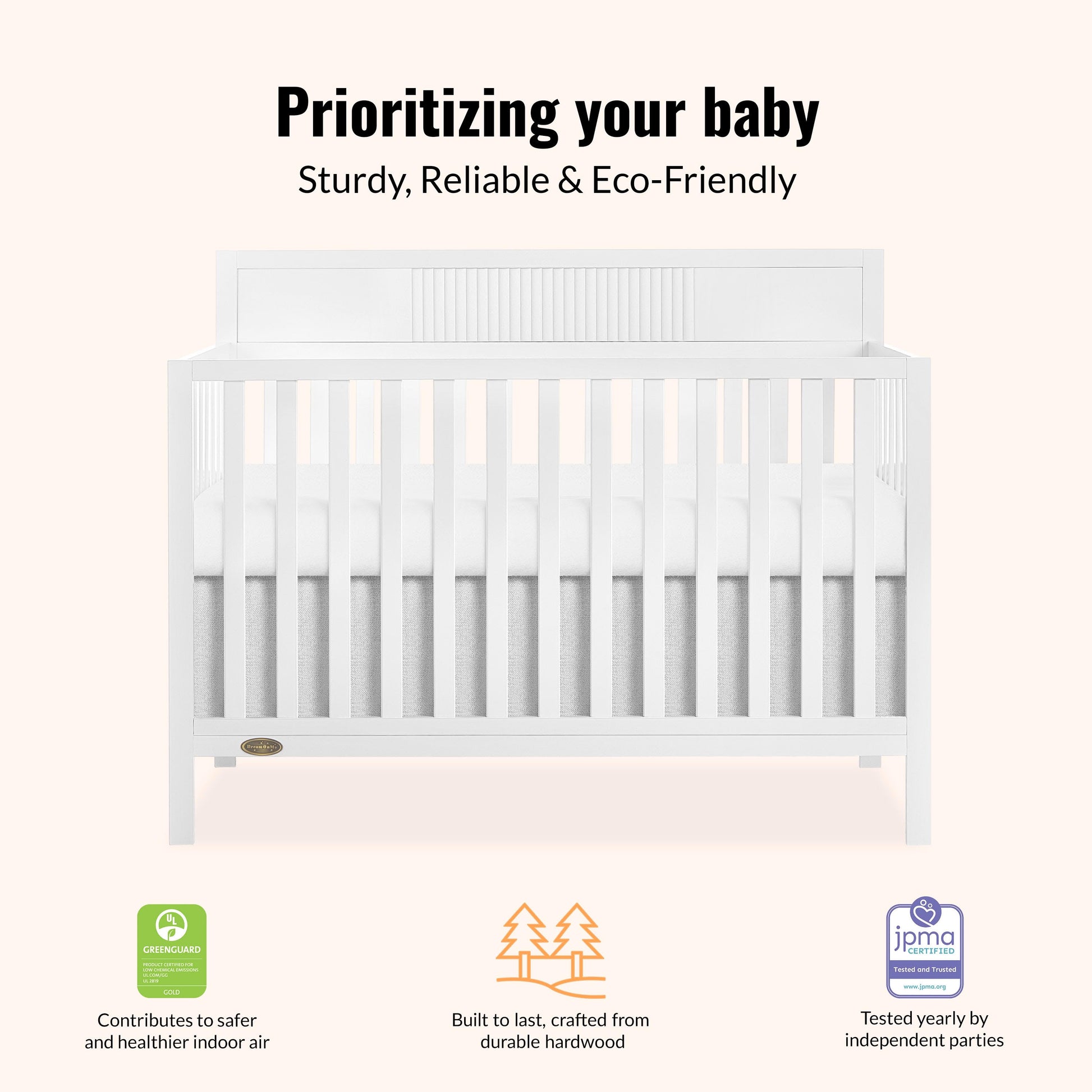 The Dream On Me Ivy 5-in-1 Convertible Crib offers long-lasting functionality, seamlessly transitioning from crib to toddler bed, daybed, and full-size bed. Crafted with a non-toxic, water-based paint finish, it ensures safety and style throughout your child's early years.