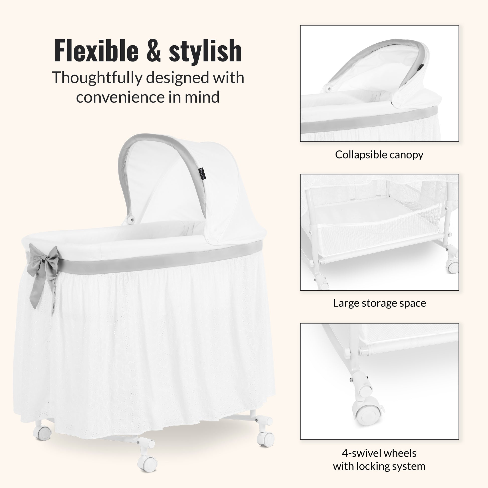 The Dream On Me Montreal Portable 2-in-1 Bassinet offers dual functionality as both a bassinet and cradle, with lockable wheels, storage, and an adjustable canopy for ultimate convenience.