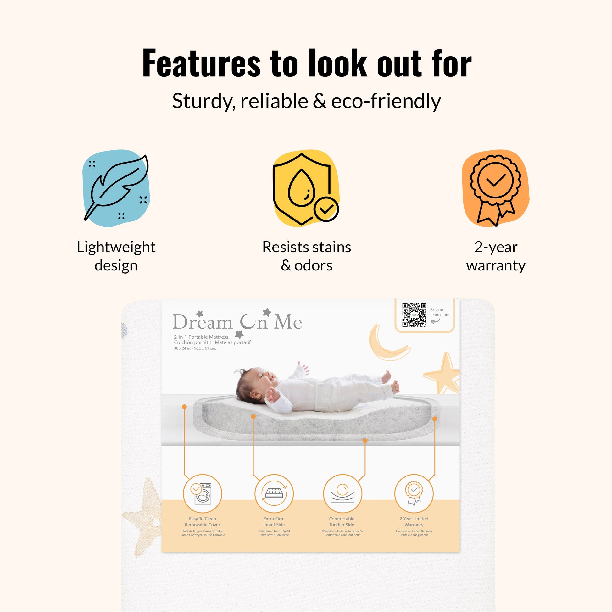 The Dream On Me Moonlight Bright Mattress offers dual-sided comfort for infants and toddlers, with a removable cover for easy cleaning, and Greenguard Gold Certification for safety.