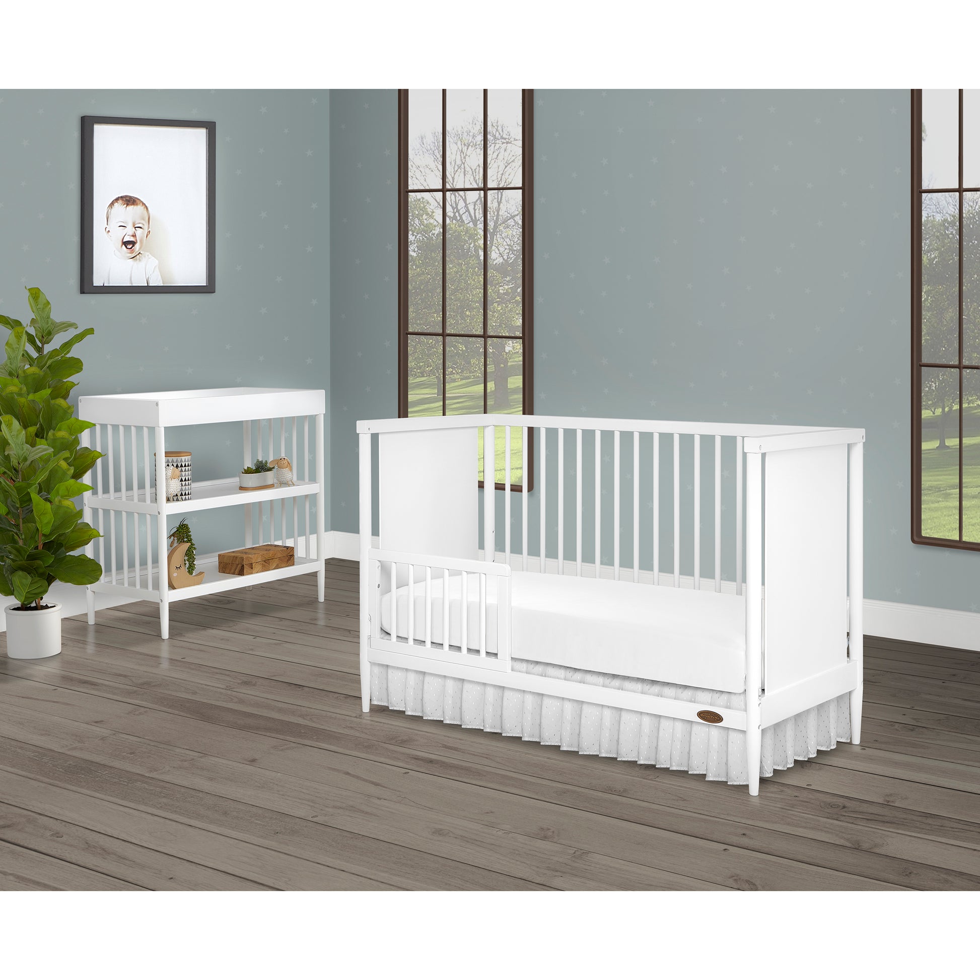 The Dream On Me Sleepy Little Sloth & Moon Bear Toddler Rail offers safety and style, with rounded spindles and a mid-century modern design, ensuring secure toddler bed transition