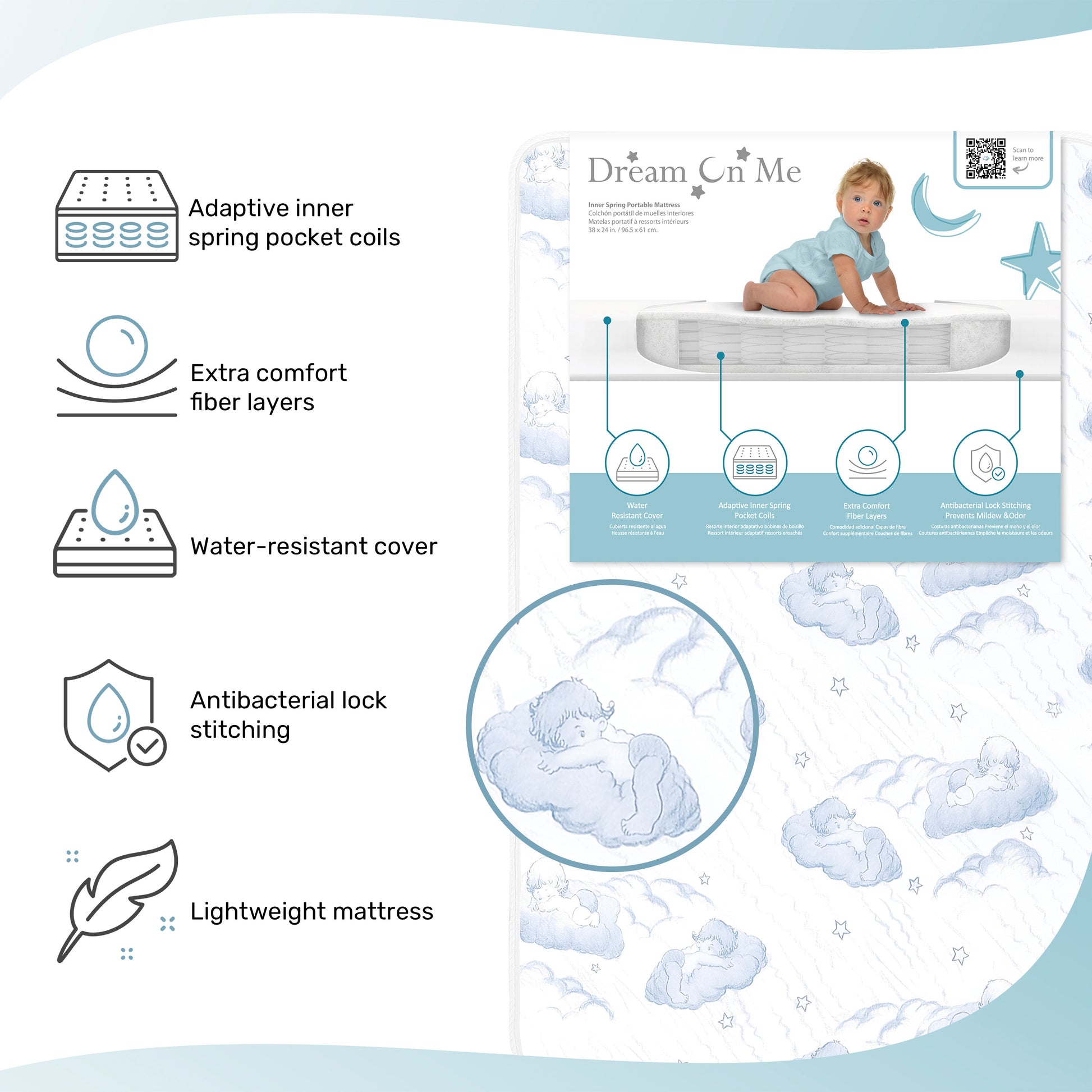 The Dream On Me Star-Burst 3" Spring Coil Portable and Mini Crib Mattress offers superior comfort with interwoven steel coils, a waterproof cover, and Greenguard Gold Certification for safety.