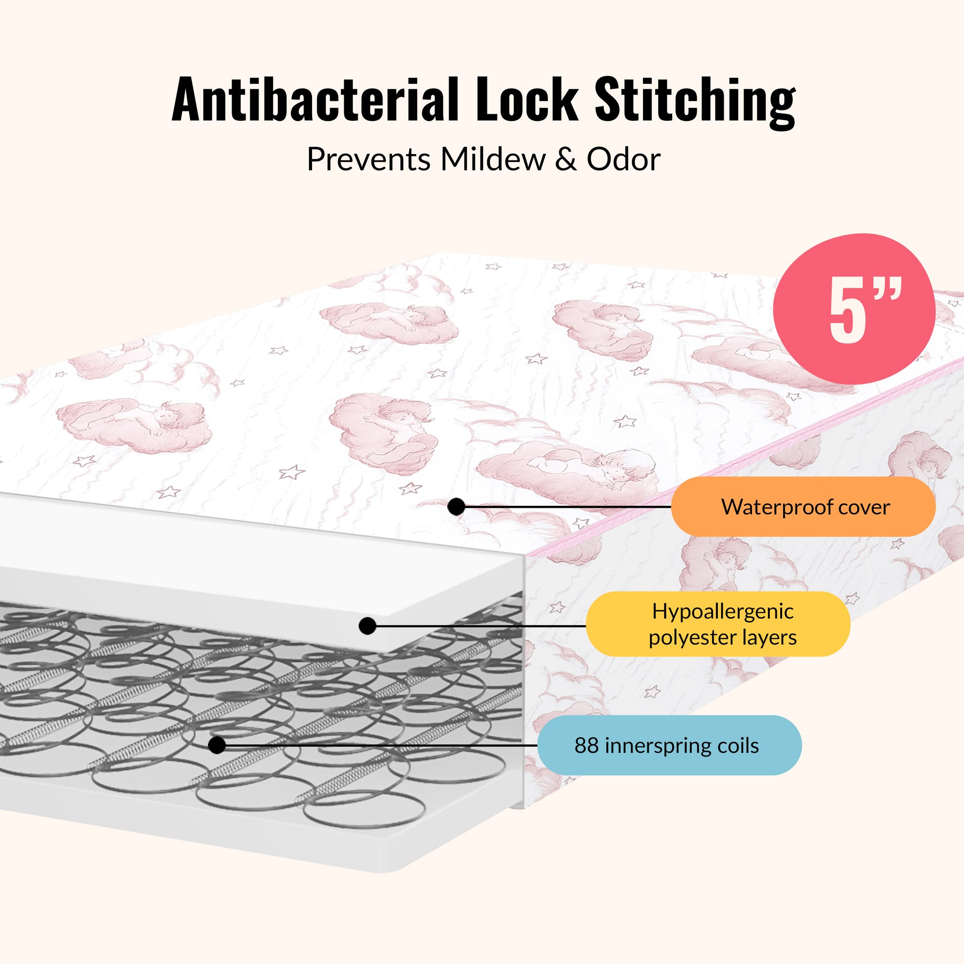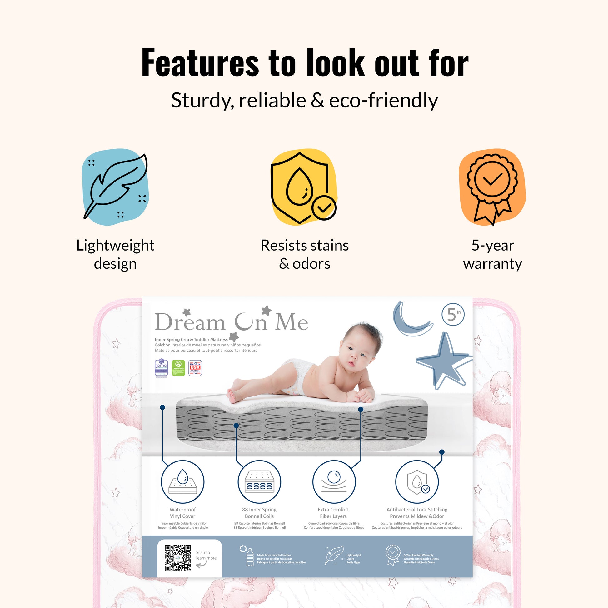The Dream On Me Twilight Spring Coil Mattress offers superior comfort with 80 interwoven steel coils, a waterproof cover, and Greenguard Gold certification for safety.