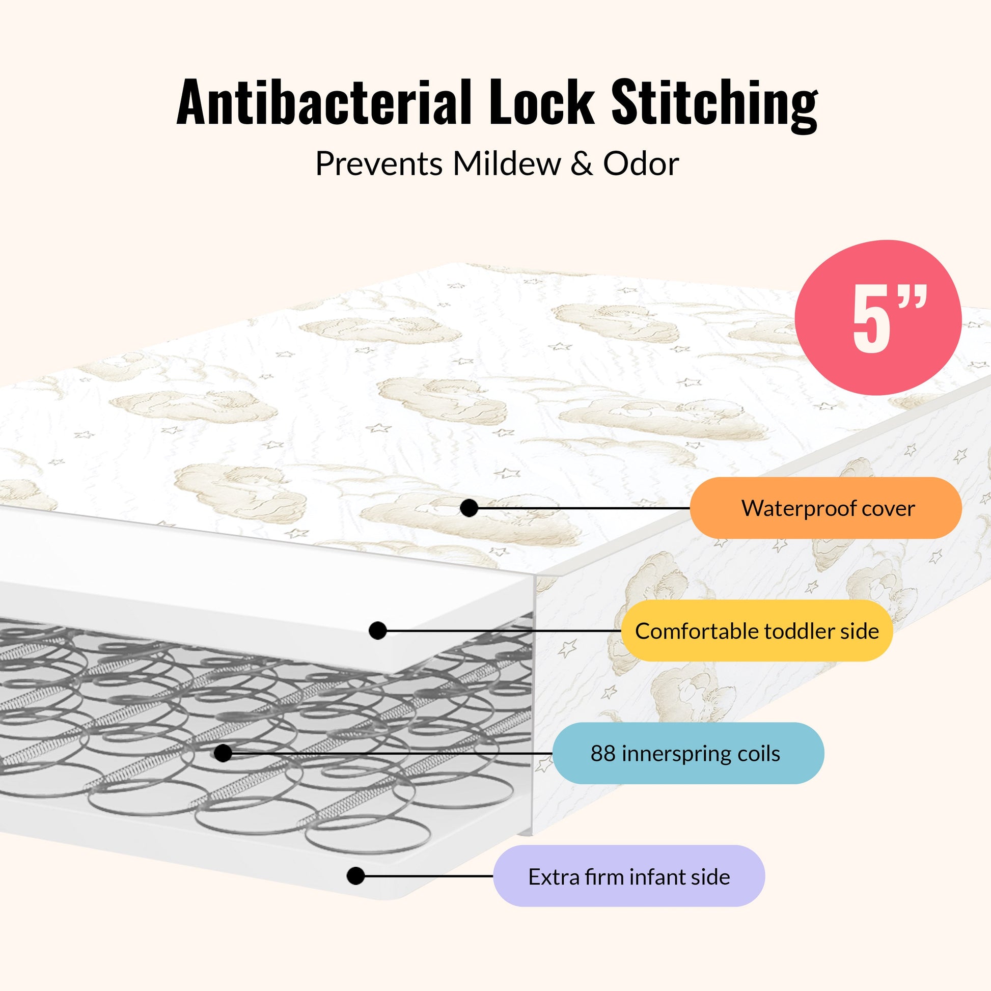 The Dream On Me Twilight Spring Coil Mattress offers optimal comfort with 88 interwoven steel coils, a waterproof cover, and Greenguard Gold certification for safe, supportive sleep.