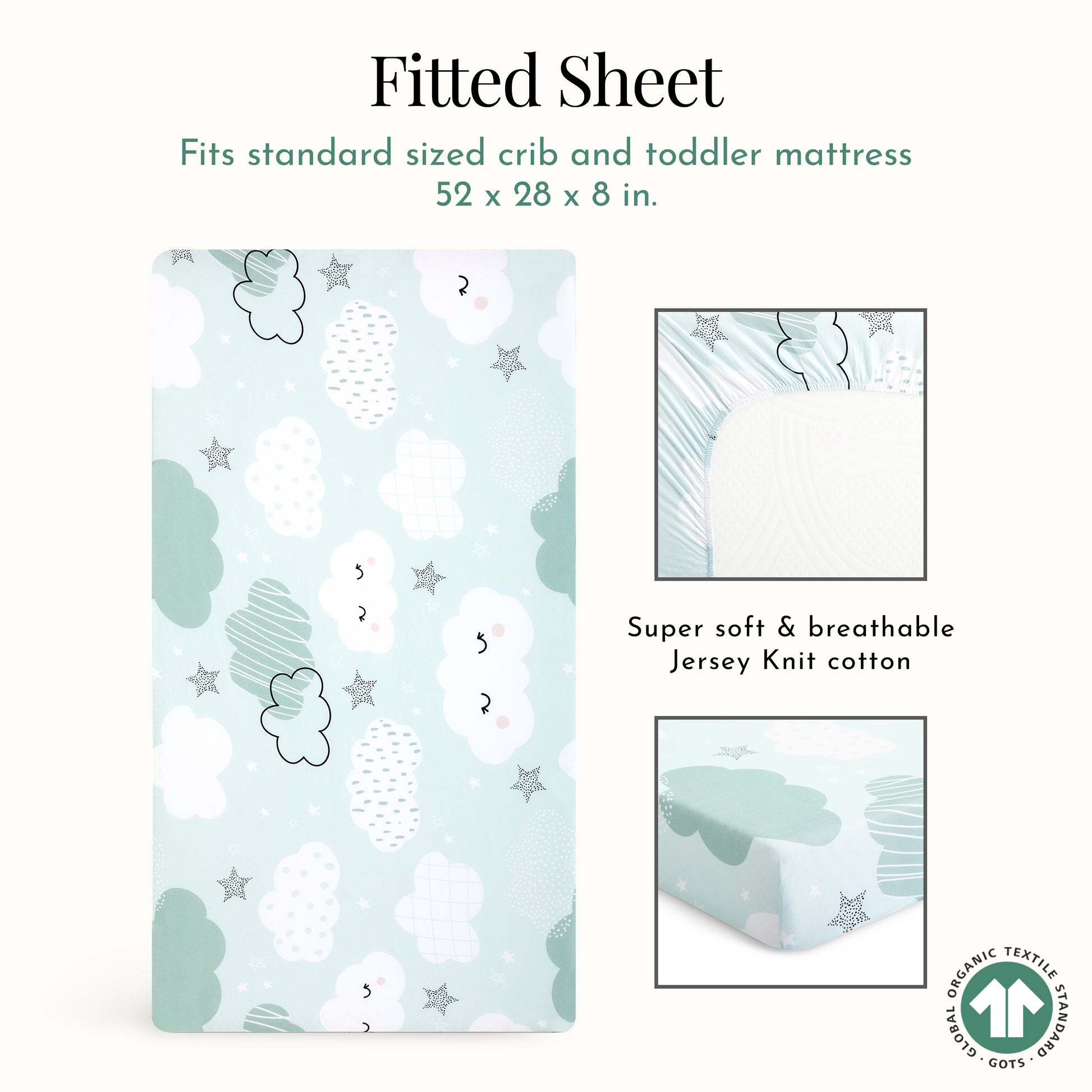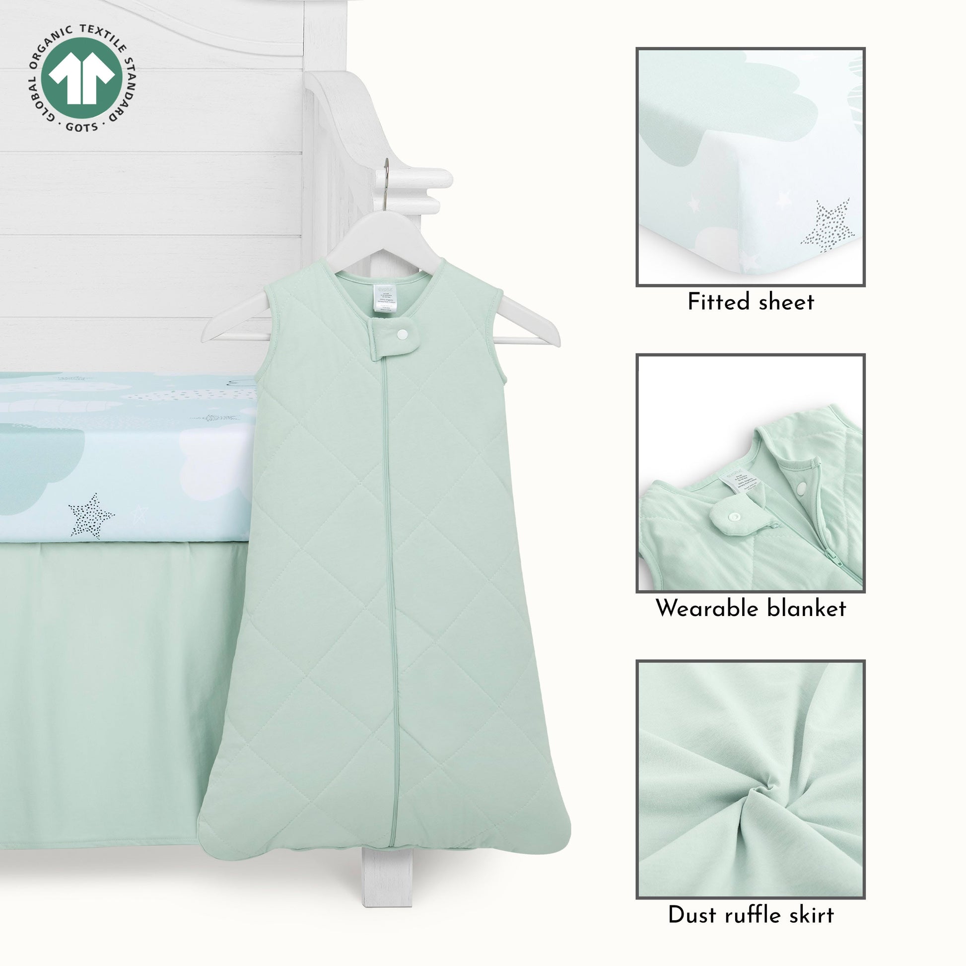 Build a warm, secure sleep environment with this carefully curated crib bedding set. Complete with a wearable blanket for cozy, swaddle-free comfort, a snug fitted sheet, and a charming crib skirt, this 3-piece set brings ease to bedtime routines and supports healthy sleep patterns. Each piece is crafted from soft, GOTS certified organic cotton and styled in nature-inspired themes your little one will adore.